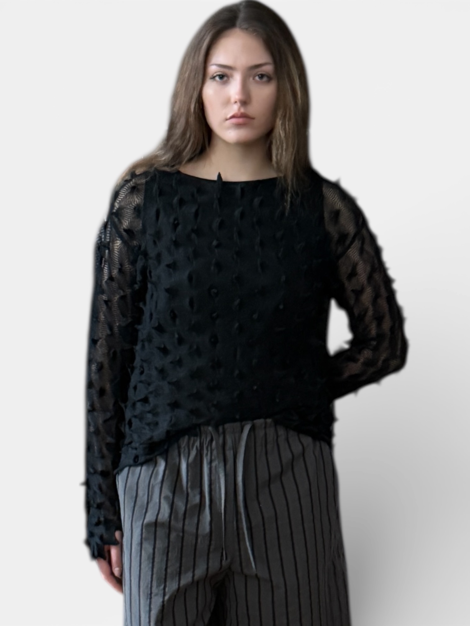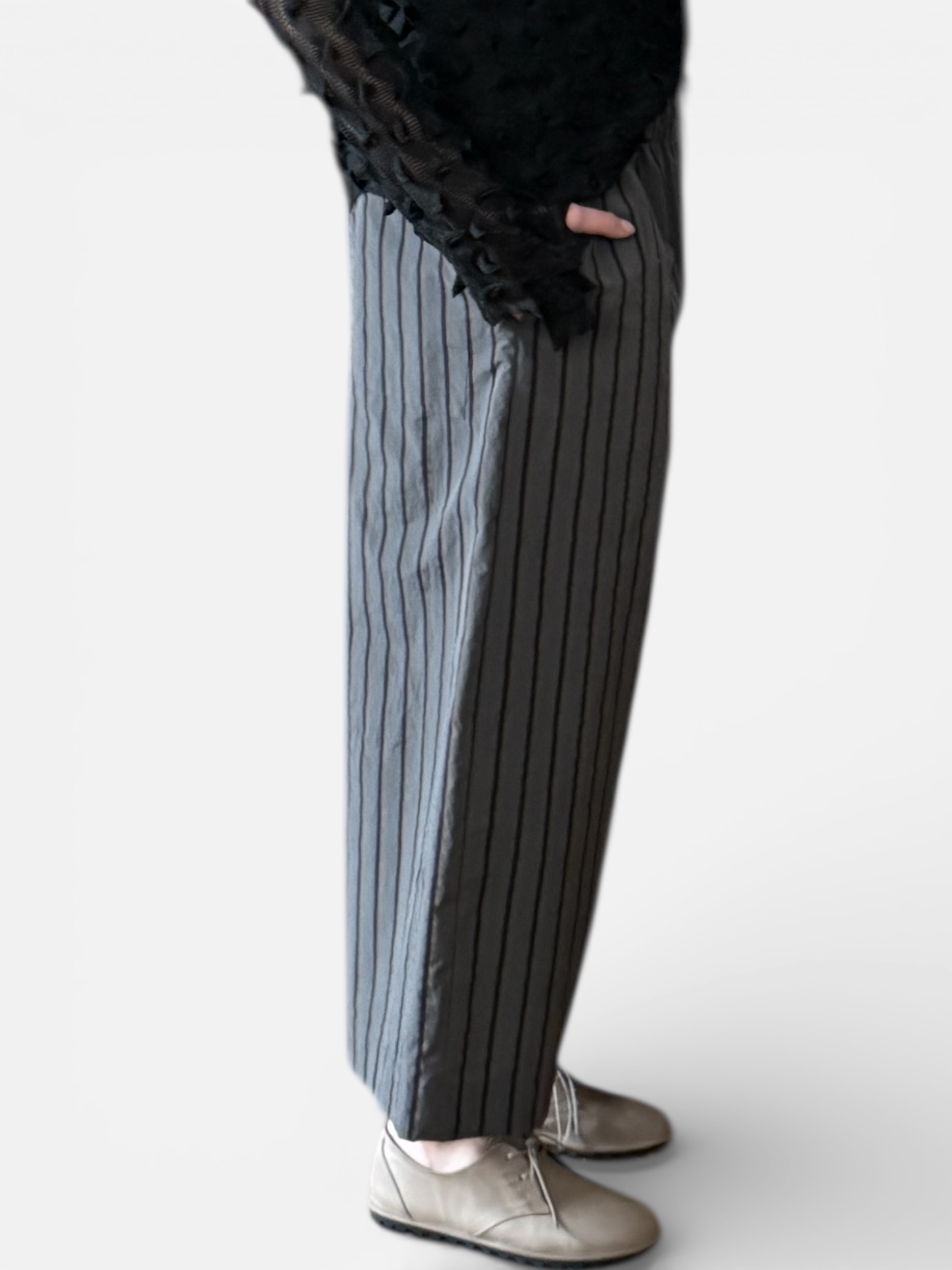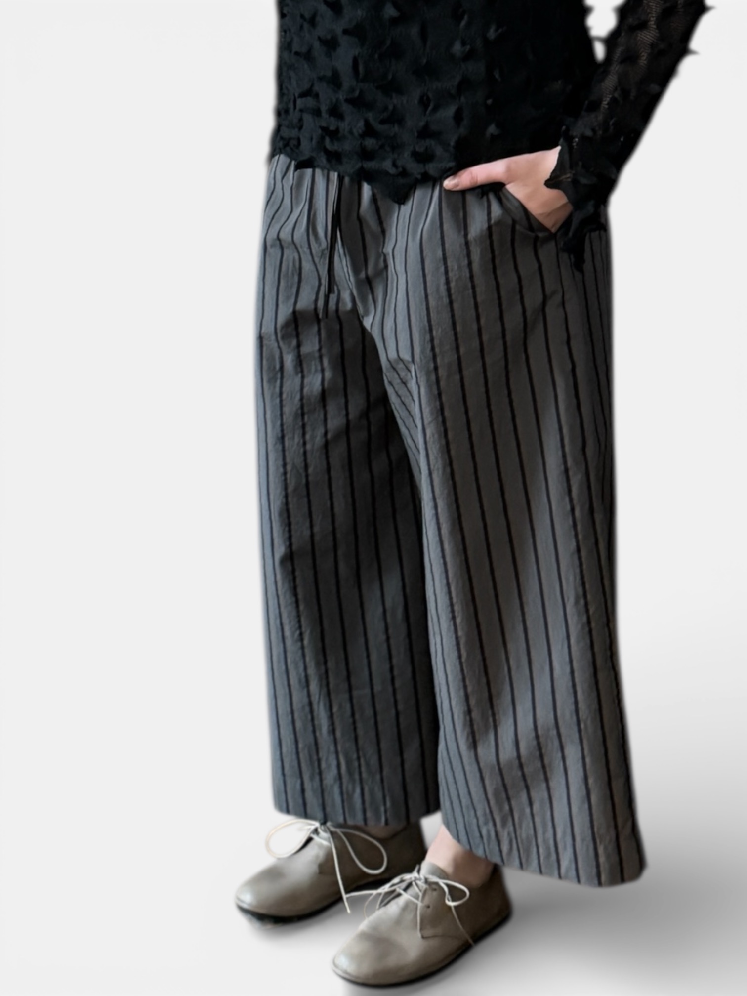 Hose „Anton“ weit geschnitten, mit Gummizug-Bund. Gestreift, mit Gesässtaschen.