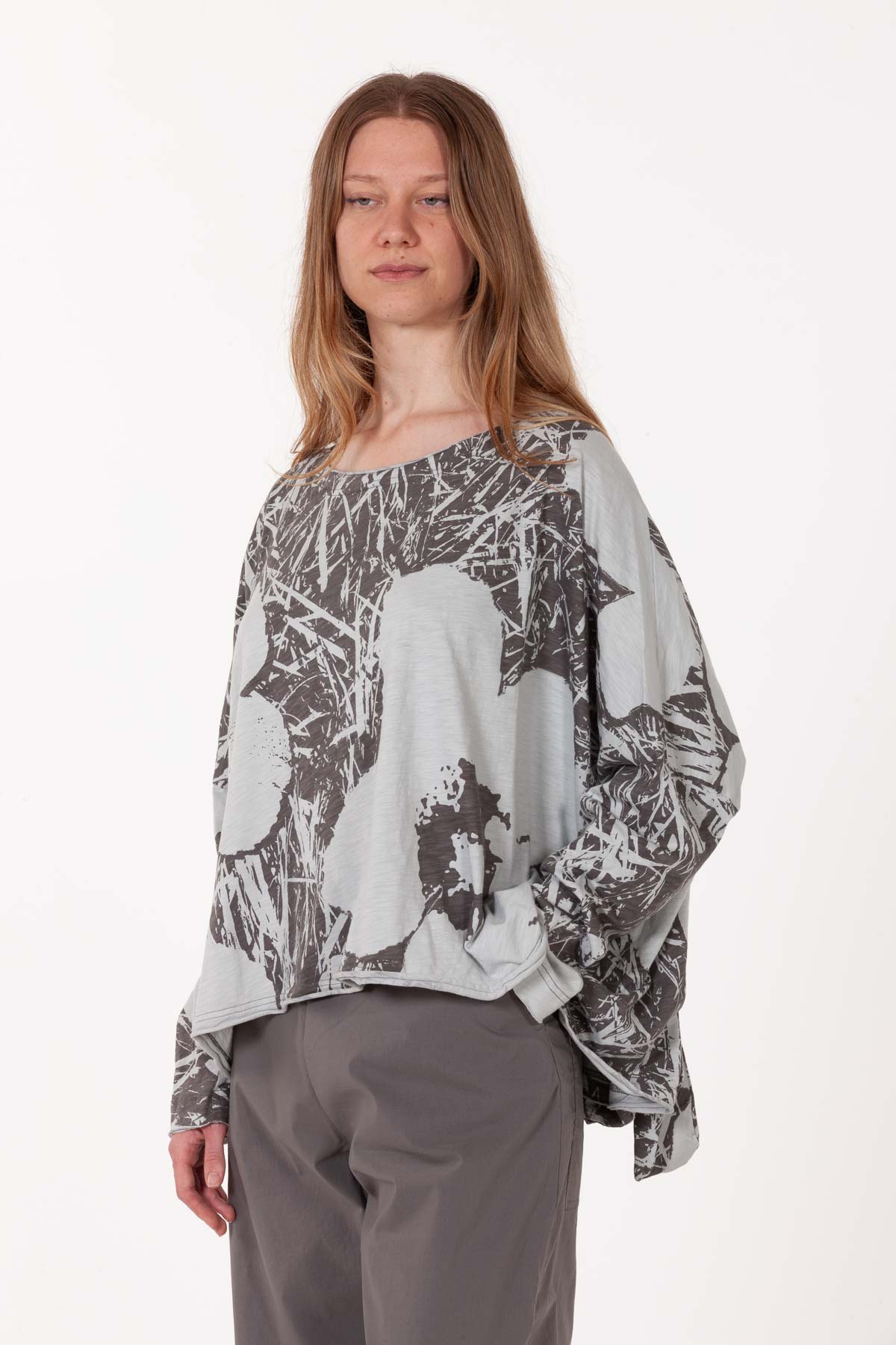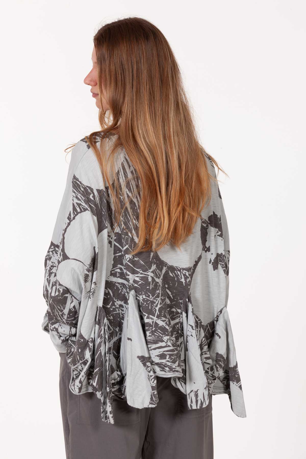100% Baumwolle, kastig und weit geschnitten. Spezielle Rückendetails